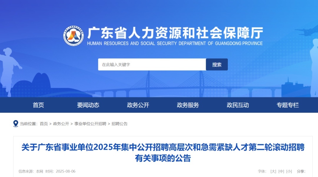 8月6日,广东省人力资源和社会保障厅发布《关于广东省事业单位2025年集中公开招聘高层次和急需紧缺人才第二轮滚动招聘有关事项的公告》(下称《公告》),全省各级事业单位招聘工作人员6465名。