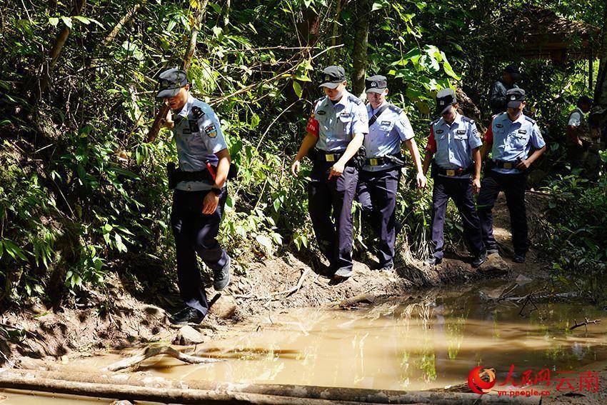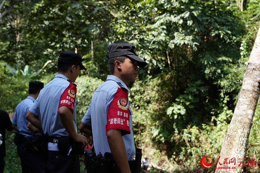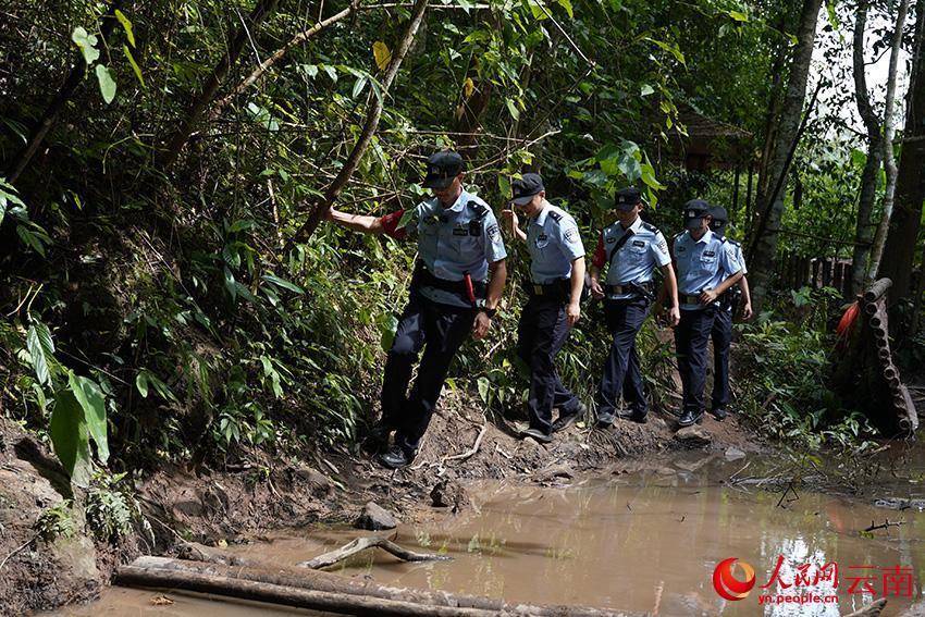 基诺山乡派出所“波懋阔扯”服务队进山巡逻时在水边看护游客。人民网记者 蔡树菁摄